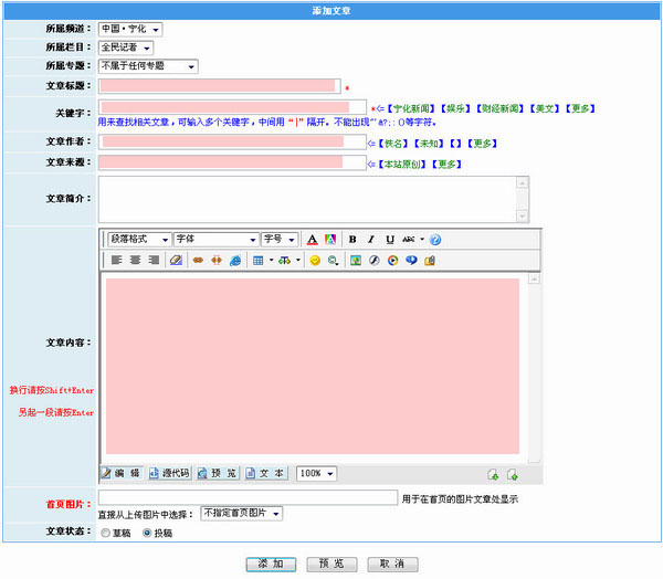 1、以下幾項必須認真填寫(上圖中紅色標注欄):(1)文章標題;(2)關鍵字;(3)文章作者:可以填寫筆名;(4)文章來源;(5)文章內容:需用純文本格式,稿件末尾附上投稿人的真實姓名,身份證號及電話號碼。