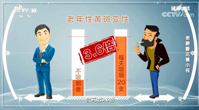吸煙是導(dǎo)致老年性黃斑變性的危險因素之一。29%的老年性黃斑變性是由吸煙引起的,每天吸煙20支以上的人,患老年性黃斑變性的概率比不吸煙的人群高出3.6倍!