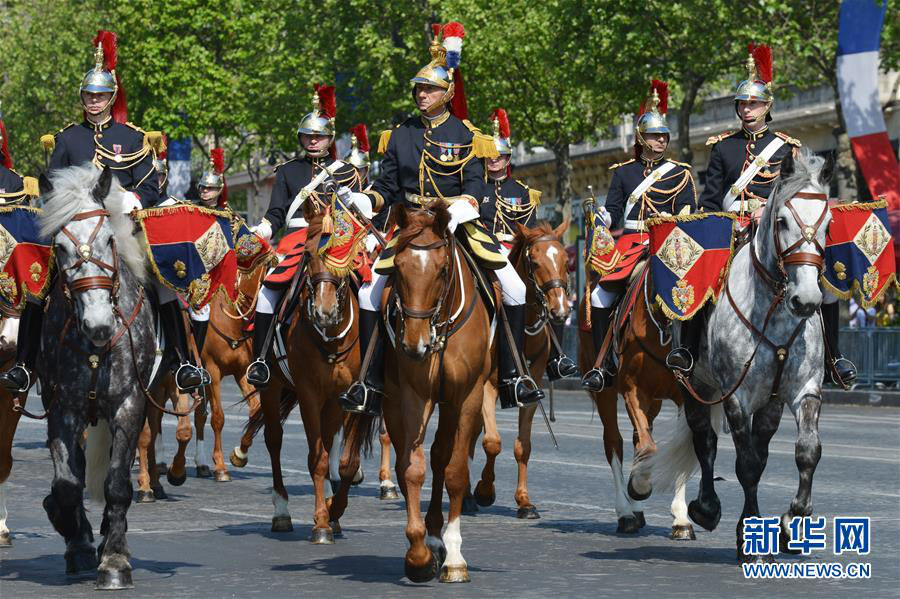2016年5月8日,法國共和國衛隊儀仗隊策馬行進在巴黎香榭麗舍大街上。當日是第二次世界大戰“歐洲勝利日”,法國在巴黎凱旋門舉行儀式,紀念二戰勝利71周年。 新華社記者李根興攝