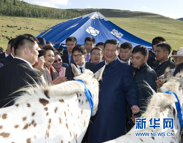 2014年8月22日,國家主席習近平在蒙古國總統額勒貝格道爾吉陪同下前往烏蘭巴托市郊觀看那達慕。額勒貝格道爾吉向習近平夫婦贈送兩匹蒙古馬。習近平為兩匹馬分別取名阿爾泰和克魯倫,寓意中蒙兩國山水相連、睦鄰友好。新華社記者 黃敬文 攝