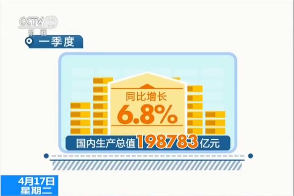 央視網消息:國家統計局今天公布今年一季度主要經濟數據,一季度國內生產總值同比增長6.8%,國民經濟運行實現了良好開局。
