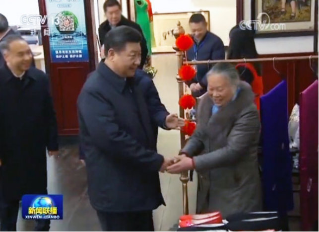 在成都市郫都區戰旗村,總書記向非遺傳承人賴淑芳詳細詢問了布鞋的制作工藝、產量、銷量等情況。
