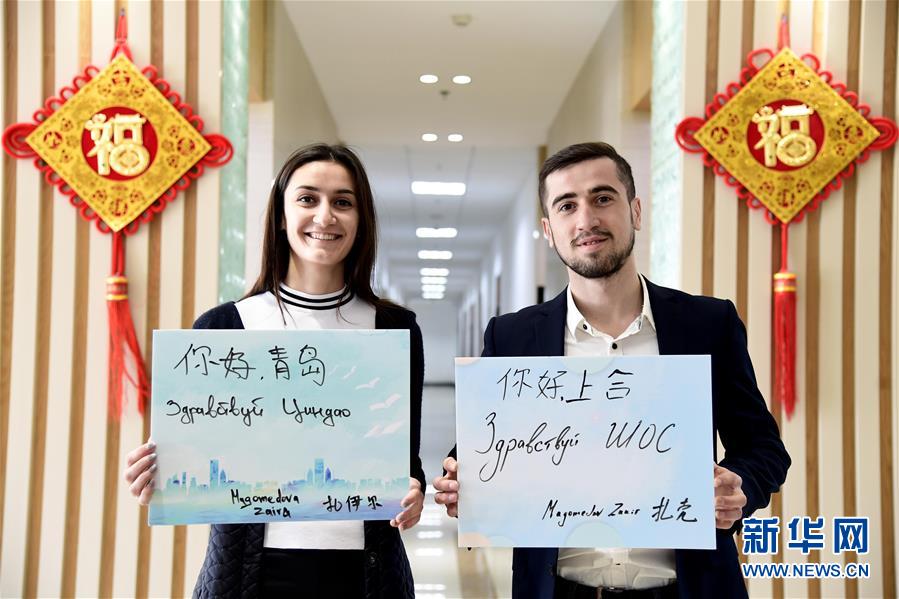 在位于青島的中國石油大學(xué)(華東)學(xué)習(xí)的俄羅斯留學(xué)生扎克(右)和扎伊爾兄妹倆用漢語和母語寫下“你好,上合”“你好,青島”(5月3日攝)。新華社記者 郭緒雷 攝