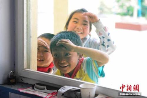 資料圖:兒童節(jié),3名學(xué)生與老師玩捉迷藏游戲,偷看老師行蹤。中新社記者 張勇 攝