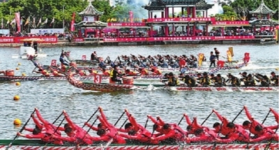 ????6月2日,2018海峽兩岸(集美)龍舟文化節(jié)暨海峽兩岸龍舟賽在廈門集美啟幕,海峽兩岸共有53支隊(duì)伍參與角逐。呂明攝?光明圖片/視覺中國(guó)