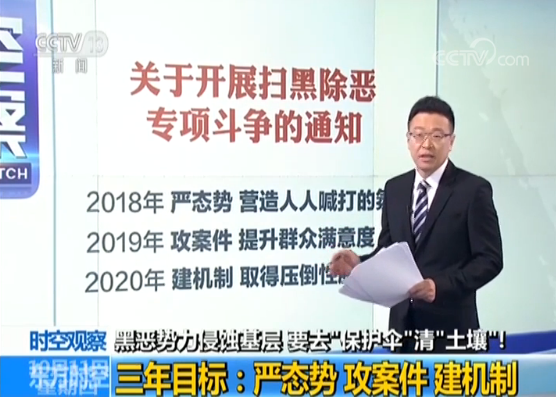 今年1月,中共中央、國務院發出《關于開展掃黑除惡專項斗爭的通知》,給出了掃黑除惡專項斗爭三年目標:2018年:嚴態勢,營造人人喊打的氛圍;2019年:攻案件,提升群眾滿意度;2020年:建機制,取得壓倒性勝利。