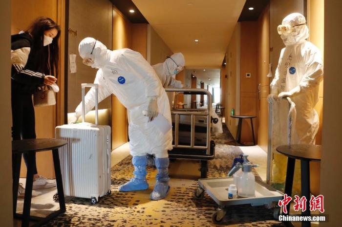 資料圖:3月16日,工作人員對即將解除隔離的旅客進行行李消毒。中新社記者 殷立勤 攝