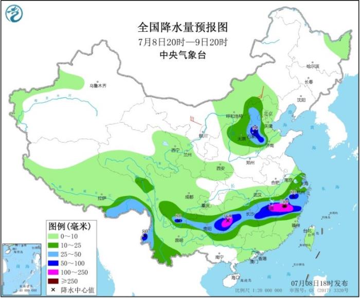據預計,7月8日20時至9日20時,江西中北部、福建北部、浙江中南部、上海、湖南中部、貴州中南部、廣西北部、云南西部和東北部、四川南部以及華北中西部等地有大到暴雨。