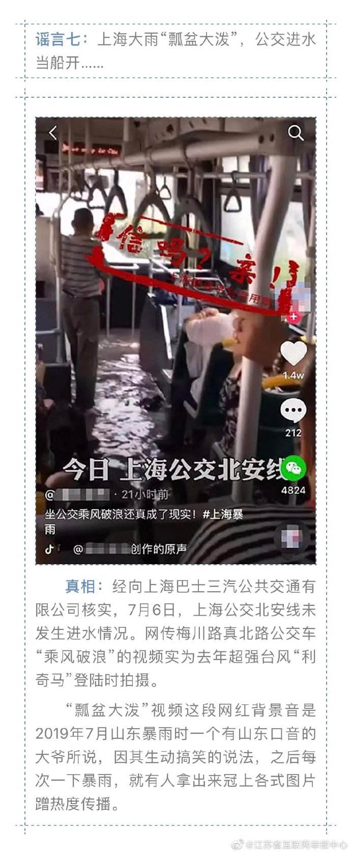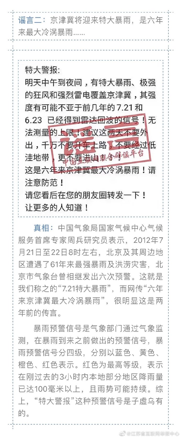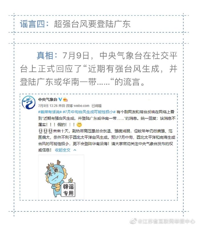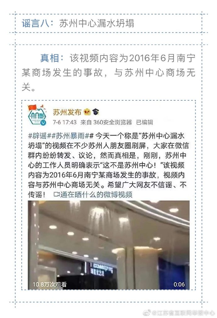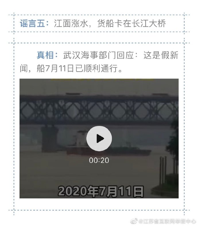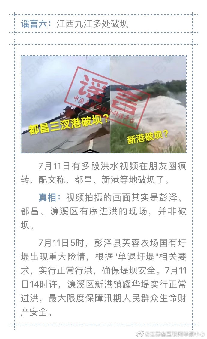 入夏以來,我國南方進入主汛期,部分地區(qū)遭遇今年以來最強降雨過程,中央氣象臺接連發(fā)布暴雨橙色預(yù)警。但災(zāi)難面前,謠言的傳播影響正常的防汛抗災(zāi)秩序。江蘇省互聯(lián)網(wǎng)舉報中心16日盤點了以下幾則汛期謠言,望廣大民眾勿恐慌,不信謠、不傳謠 !