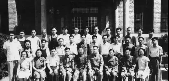 △1951年近代物理研究所全體人員。前排左起:胡文琦、肖振熹、鄧稼先、彭桓武 、趙忠堯、錢三強 、何澤慧、肖健、王素銘。