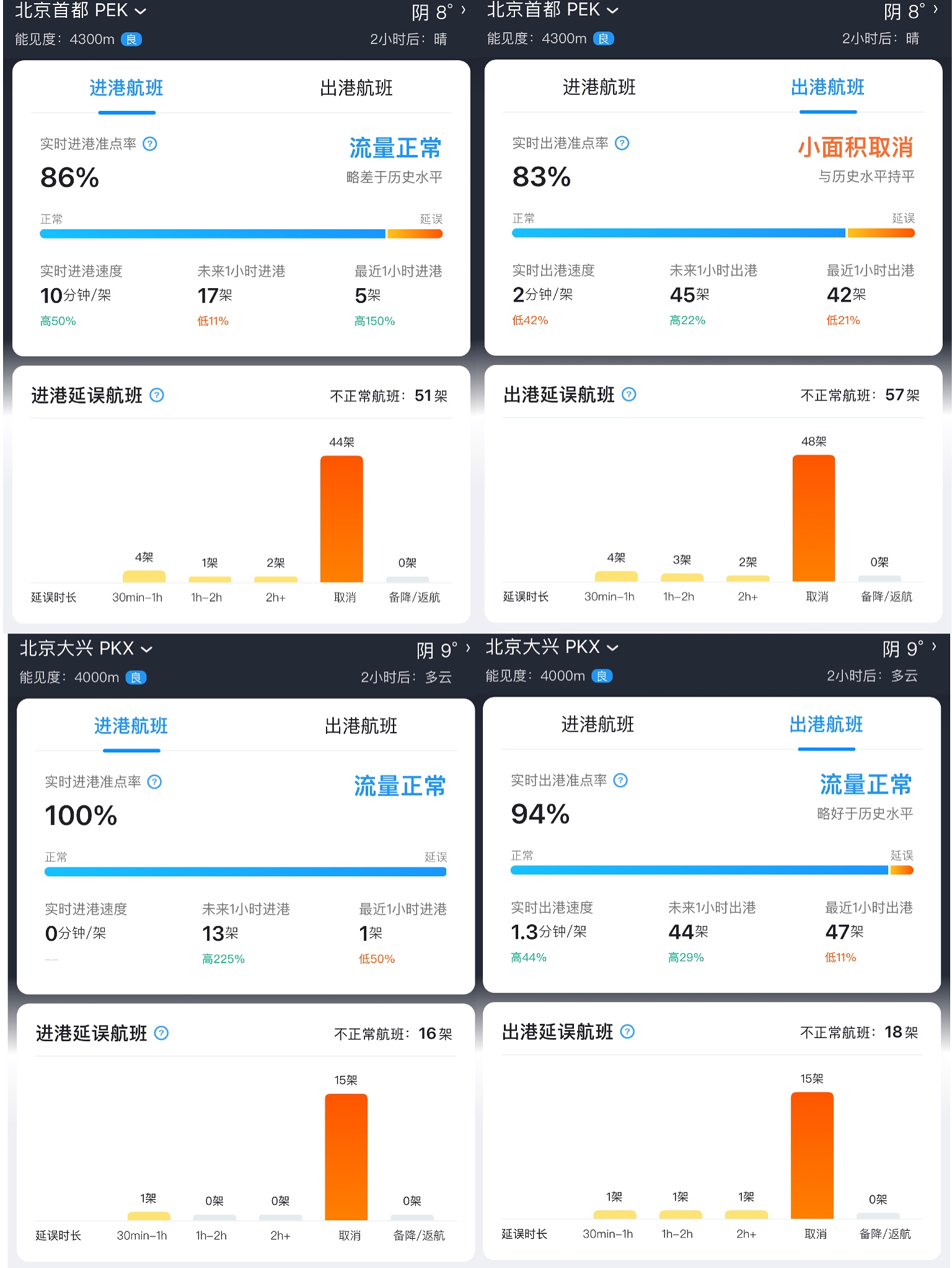 航班方面,飛常準APP顯示,截至發稿,北京首都機場進港航班流量正常,出港航班小面積取消;北京大興機場進港航班及出港航班,流量均正常。