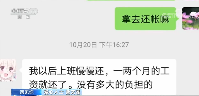 愛心人士 曹文芳:我當時就覺得很奇怪,很驚訝。因為你想捐款才兩三天,怎么又退回去了。我立馬就去微信里面去找她,退了款之后,你怎么辦?難道這個病不治療了?還是自己放棄了?我一直覺得這個孩子是很樂觀、很陽光的,馬上找她問明了原因,她說是借到錢了,別人掙錢也不容易。當時我聽到這個話的時候,我自己眼淚都要掉出來了。