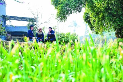 2020年7月,北京高校畢業生姜鵬(右一)成為一名選調生,來到重慶基層工作。圖為他在八角井村農戶院壩中與村民交流。新華社發
