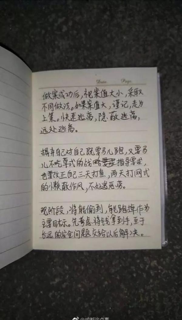 這兩天,有個微博超級火,說的是警察蜀黍抓到一個盜竊嫌疑人,然后從他身上搜出了一個筆記本,工整地寫滿了各種“作案攻略”,包括道路規劃、派出所地址、作案原則、作案反思……