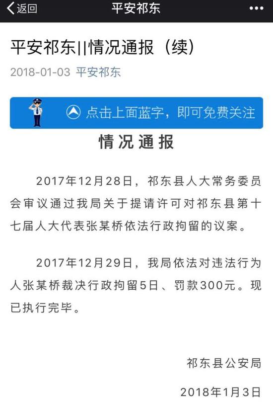 1月3日,祁東縣公安局微信公號“平安祁東”通報:2017年12月28日,祁東縣人大常務(wù)委員會審議通過我局關(guān)于提請許可對祁東縣第十七屆人大代表張某橋依法行政拘留的議案。 2017年12月29日,我局依法對違法行為人張某橋裁決行政拘留5日、罰款300元。現(xiàn)已執(zhí)行完畢。