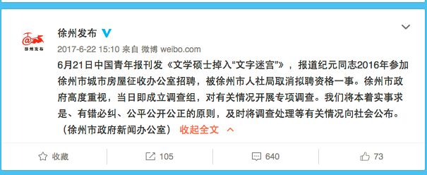 此事讓另一起雷同事件重回公眾視野。去年6月,媒體持續(xù)關注了江蘇徐州碩士筆面試第一被拒錄,只因徐州人社局認為其所學專業(yè)是“比較文學與世界文學”不是招考要求的“中國語言文學”。盡管考生的母校為此開了證明,國務院學位辦的專業(yè)劃分也很明確,但當地未糾錯。
