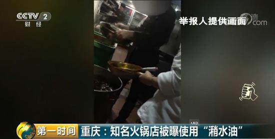 采訪中,記者又得知一個消息,其實,使用潲水油的,不止這一家涉事的火鍋店,目前重慶食藥監部門已經接到對另外三家店涉嫌使用潲水油的舉報。記者了解到,被曝光的重慶大隊長主題火鍋北城天街店廚房內的畫面,是當地一家法律咨詢公司的負責人,安排臥底進入店內,工作5天半期間拍下的。
