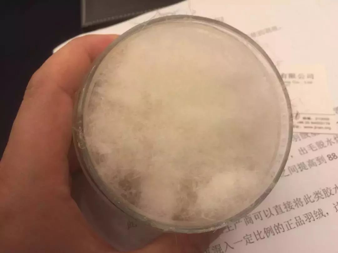 一些造假作坊,正是在水洗和烘干過程中,通過膠水粘絨劑將低品質的碎毛和脫落的絨絲粘連成朵,把“絨絲”變成“絨子”,使含絨量較低的羽絨原料搖身一變,成了高含絨量的高品質羽絨。