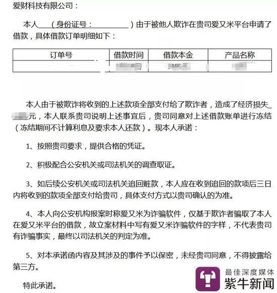 對于“校園貸”被禁止,為何以大學生身份在“愛又米”APP上驗證后,還是可以進行網貸提現業務?鄭小姐稱:“這個我不是很清楚,可能平臺本身就提供這個業務吧。”不過,在諸多詐騙案件發生后,愛財科技有限公司向受害者發送了一個協議,稱將在平臺上借的錢暫時凍結,在凍結期間可以不計算利息及要求本人還款。“表面上是對我們有利的,但其實附帶了協議之外的很多要求。”一名受害者說,甚至還有逼迫。