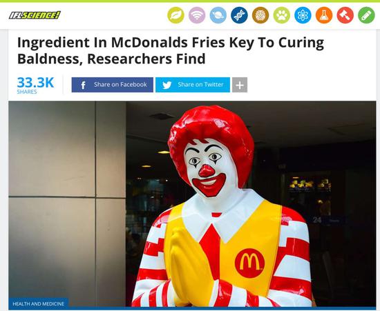 美國愛科學(xué)網(wǎng)站(IFLScience):“研究發(fā)現(xiàn),麥當(dāng)勞薯?xiàng)l里含有治脫發(fā)的關(guān)鍵性成分”。。。