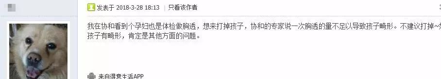 3月28日,武漢網友“愛文晞”發帖稱,去年單位體檢,自己也不知已經懷孕,做了胸透。到武漢醫院做產檢,醫生說不能保證小孩會不會有問題,但醫學上沒有證明做胸透會致小兒畸形,建議先留著,產檢時發現問題再解決。