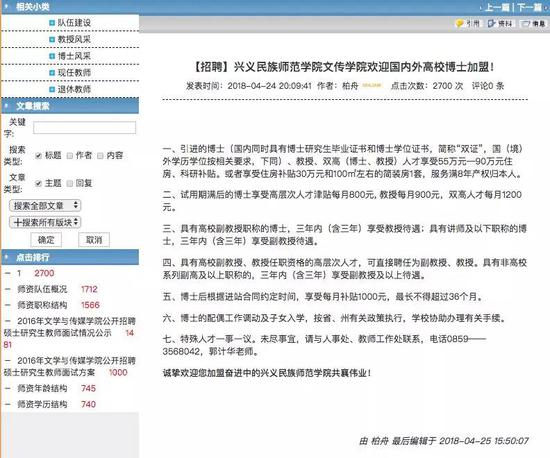 在興義民族師范學院文傳學院官網上,觀察者網小編找到了這篇招聘啟事,網頁顯示是昨晚八點多發布的。