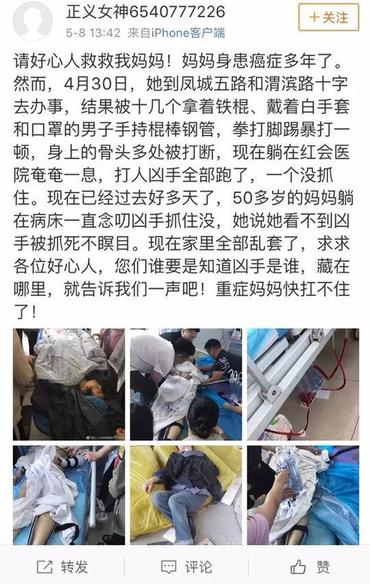 患癌母親遭十余名陌生男子打成骨折 女兒發帖追兇