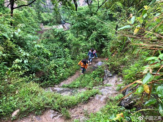 從河谷向上艱難地爬了近半個小時,7點半,記者終于來到了寨子里。楊紹書正帶著5個孩子們準備從這兒出發(fā),爬山趕去學校。