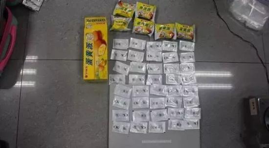 經仔細檢查,民警發現3盒蛋糕內共藏了100包淡黃色粉末狀毒品,這種毒品俗稱“奶茶”,它的形狀是淡黃色粉末狀,成分是含有冰毒、K粉、搖頭丸成分。