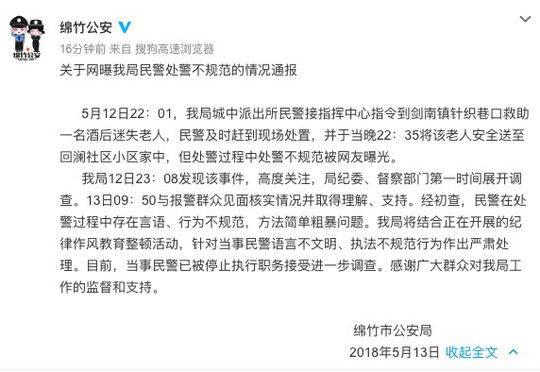 13日下午5點過, 綿竹市公安局通過官方微博發(fā)布通告稱,“ 5月12日22:01,我局城中派出所民警接指揮中心指令到劍南鎮(zhèn)針織巷口救助一名酒后迷失老人,民警及時趕到現(xiàn)場處置,并于當晚22:35將該老人安全送至回瀾社區(qū)小區(qū)家中,但處警過程中處警不規(guī)范被網(wǎng)友曝光。”