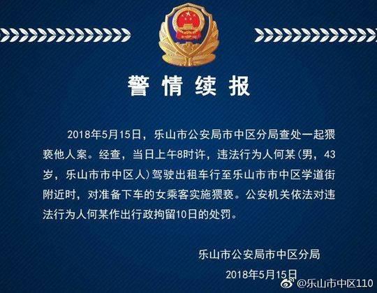 當天下午6時43分,該分局發布《警情通報》表示:5月15日,樂山市公安局市中區分局查處一起猥褻他人案。經查,當日上午8時許,違法行為人何某駕駛出租車,行至樂山市市中區學道街附近時,對準備下車的女乘客實施猥褻。公安機關依法對違法行為人何某作出行政拘留10日的處罰。