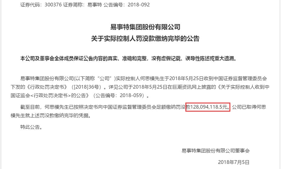 這份“老賴”名單果然威懾力驚人,7月5日,易事特(300376,SZ)午間公告稱,公司實控人何思模于5月25日收到證監(jiān)會《行政處罰決定書》。截至目前,何思模已按照決定書向證監(jiān)會足額繳納罰沒款1.28億元。公司已取得何思模就上述罰沒款繳納完畢的憑據(jù)。