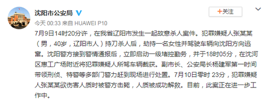 @沈陽市公安局:7月9日14時20分許,在我省遼陽市發生一起故意殺人案件。犯罪嫌疑人張某某(男,40歲,遼陽市人)持刀殺人后,劫持一名女性并駕駛車輛向沈陽方向逃竄。沈陽警方接到警情通報后,立即啟動一級堵控勤務,并于18時05分,在沈河區惠工廣場附近將犯罪嫌疑人所駕車輛截獲。副市長、公安局長楊建軍第一時間帶領刑偵、特警等多部門警力趕到現場進行處置。7月10日零時 23分,犯罪嫌疑人張某某欲傷害人質時被警方擊斃,人質被成功解救。目前,此案正在進一步工作中。