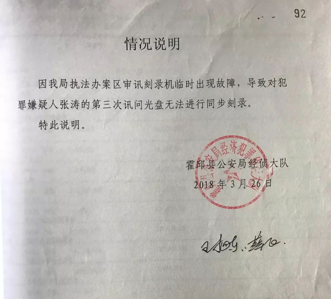 ▲霍邱縣公安局經(jīng)偵大隊(duì)出具的關(guān)于張濤第三份筆錄錄像無(wú)法同步刻錄的說(shuō)明。受訪者供圖