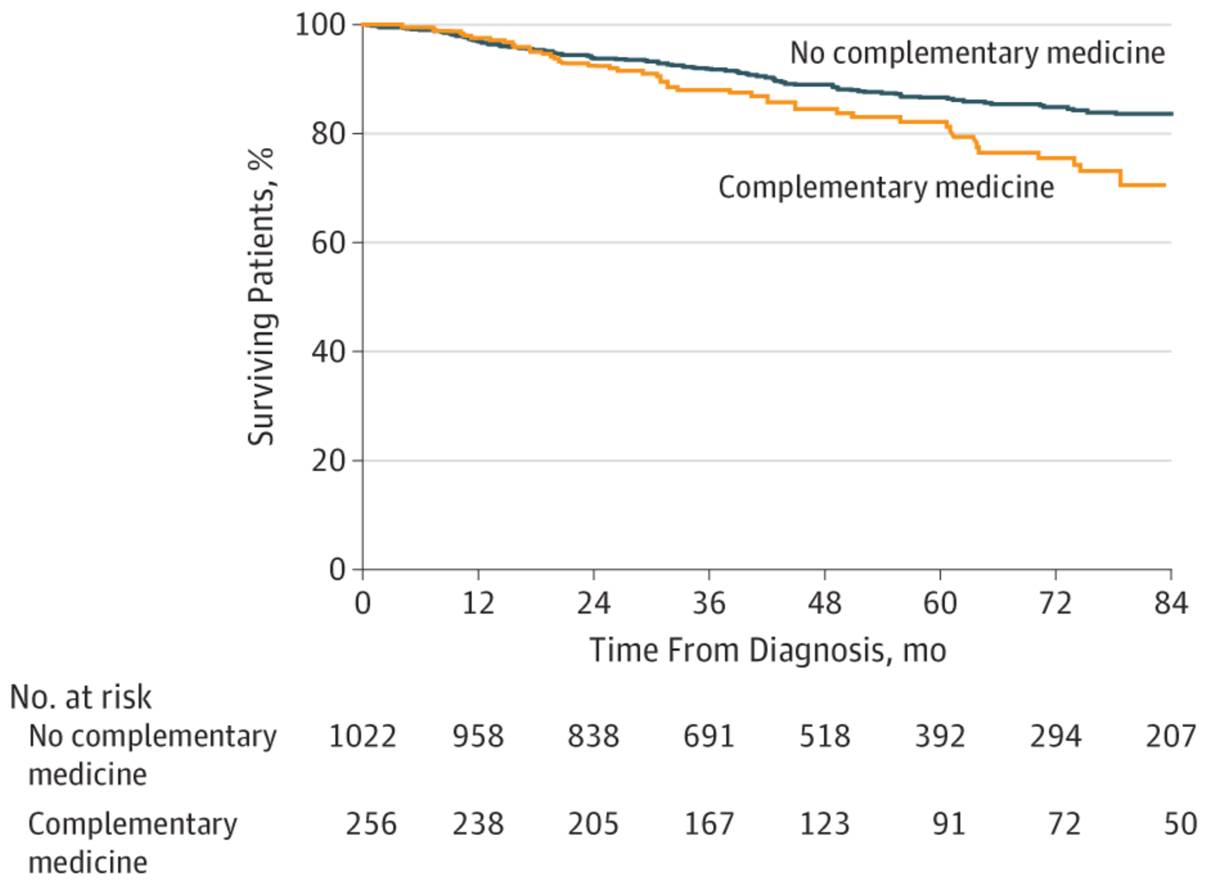使用過補充醫(yī)學(xué)療法的患者(黃線)生存率顯著下降。