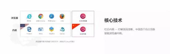 而且紅芯官網(wǎng)上,紅芯公司還把紅芯瀏覽器與微軟的IE、谷歌Chrome、火狐等瀏覽器并列,把紅芯內(nèi)核與Trident、bilnk、WebKit等內(nèi)核并列。并特別說明了瀏覽器內(nèi)核代碼超過1000萬行,相當(dāng)于Linux內(nèi)核。