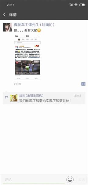 劉師傅在譚先生的朋友圈動態下留言“我們體現了和諧”