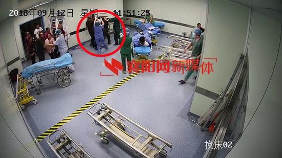 監控顯示:9月12日11:49,手術室交換間的門打開,有4人走了進來。11:50,多人圍在交換間門口;11:51,姚瑞林走到門口時,3名男子動了手,將他從門口追打至東墻。之后,雙方被醫護人員隔開。