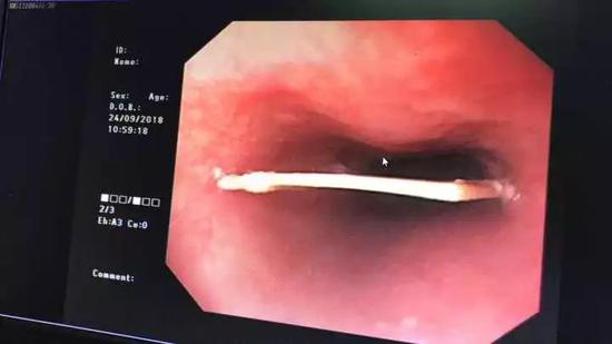 通過無痛胃鏡一看,小龍的食道里有個3厘米的鴨骨頭卡著,并且已有輕微劃傷出血,最后在醫護人員的努力下,骨頭被安全取出。