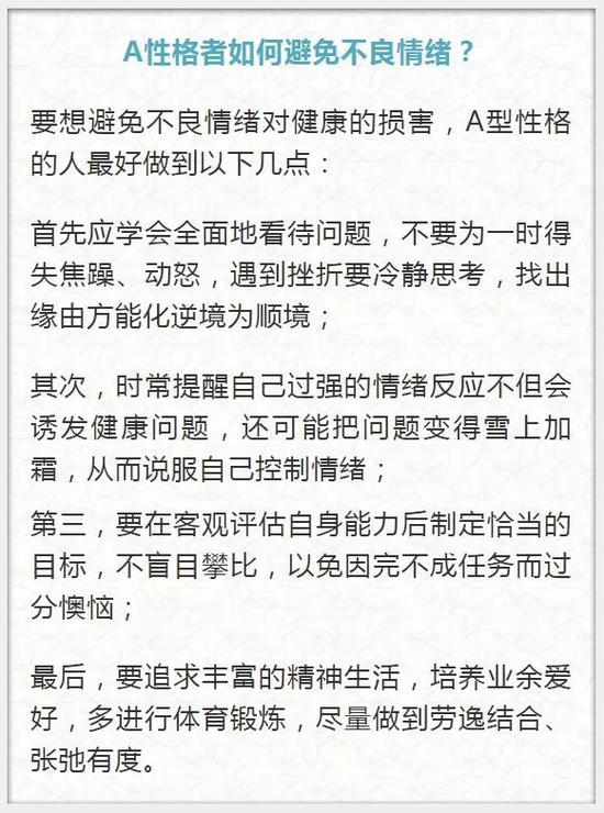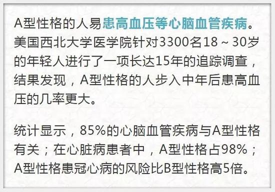 美國(guó)《赫芬頓郵報(bào)》刊文指出,A型性格的人有遇到妨礙進(jìn)程的事情容易動(dòng)怒、做事往往盡善盡美、經(jīng)常坐立不安、會(huì)不由自主地?fù)?dān)心未來(lái)、遇挫折很難入睡等特點(diǎn)。