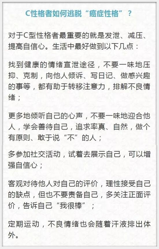另外,生活和工作中,C型性格的人一般沒(méi)有主意和目標(biāo),容易隨波逐流,常常伴有孤獨(dú)感和無(wú)助感,活得很累。