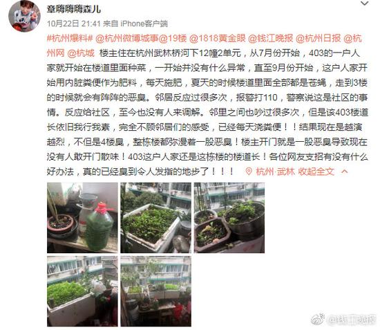 家住武林橋河下12幢2單元的網友@章嗨嗨嗨森兒 爆料:從7月份開始,同幢樓的一戶人家就開始在樓道里種菜,一開始并沒有什么異常,直至9月份開始,這戶人家開始用內臟糞便作為肥料,每天施肥,夏天的時候樓道里面全部都是蒼蠅,走到3樓的時候就會有陣陣惡臭。現在更是越演越烈,不但是4樓臭,整棟樓都彌漫著一股惡臭!目前,多次協調未果,爆料網友已經崩潰了!