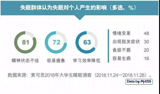 失眠對大學生的前三位影響包括:精神狀態不佳(81%)、容易疲憊(72%)和學習效率降低(63%)。另外30%的失眠群體表示自己出現脫發癥狀。