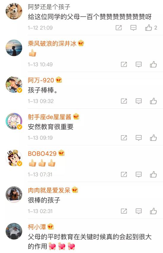 這兩位小朋友在被困電梯的情況下沒有慌張無措,而是保持鎮(zhèn)定,采取措施積極自救。這樣機智勇敢的“教科書式”自救受到了民警的表揚,也贏得了網(wǎng)友們的贊賞: