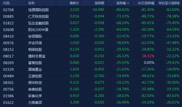佳源國際控股大跌80%,仁天科技控股跌73%,弘達金融控股跌68%;陽光100中國一度暴跌逾70%,股價不足1元,淪為仙股,最終收跌64%。