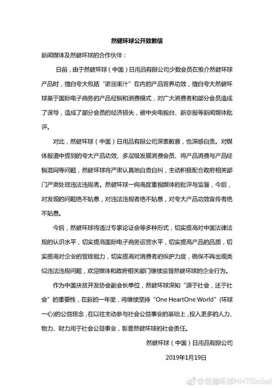在然健環球公司發布公告稱媒體報道為謠言后不久,哈爾濱市食藥監局發出公告決定對當地然健環球公司進行摸底排查。本月19號,然健環球召開媒體說明會,進行公開道歉,承認自身存在問題。然健環球大中華區經理吳耀棠:“對廣大消費者和部分會員造成了誤導,造成了部分會員的經濟損失,對此然健環球(中國)日用品有限公司深表歉意,對媒體報道中提到的夸大產品功效、多層級發展消費會員,將產品消費和產品經銷混同等問題,然健環球將嚴肅認真地自查自糾,主動積極配合政府相關部門,嚴肅處理違法違規者。 ”