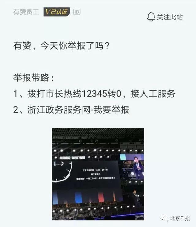 網傳杭州電商公司有贊近日舉行的年會上,公司高層突然宣布將實行“996上班制”,消息在網絡上傳播后引發廣泛關注。“年會開成了鴻門宴”,有自媒體發布消息和截圖稱,有自稱贊員工的網友表示,已經撥打市長熱線舉報。