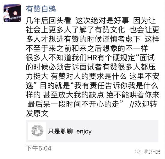 他還透露,有贊HR(人力資源部)有個硬規定,“面試的時候必須告訴面試者有贊很多人都壓力挺大,有贊對人的要求是什么,這里不安逸”,目的就是“我有責任告訴你我是什么樣的,甚至放大我的缺點絕不能哄著你來,最后呆一段時間不開心的走”。
