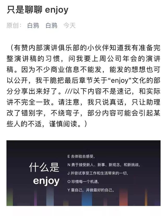 1月27日下午,有媒體報道,有贊CEO白鴉在自己的微信公眾號“白鴉”發文《只是聊聊 enjoy》,算是對上述事件的間接回應。他在朋友圈轉發此文時表示:幾年后回頭看,這次絕對是好事。讓更多人了解了有贊文化,也會讓人才想進時謹慎考慮,不至于來之前和來之后不一樣。