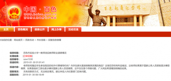 1月29日,百色市右江區(qū)新聞中心通過其官方微信發(fā)布落款為百色市右江區(qū)教育局的《關(guān)于網(wǎng)傳百色市實驗小學(xué)一名教師違反教師職業(yè)道德的情況通報》。通報稱,目前當(dāng)?shù)赜嘘P(guān)部門已就此事成立工作組。經(jīng)初步調(diào)查,家長所反映的問題基本屬實,但具體情況還需進一步核查。目前,右江區(qū)教育局已責(zé)成百色市實驗小學(xué)暫停該教師的班主任職務(wù),由該班副班主任代理班主任工作。右江區(qū)紀(jì)委駐教育局紀(jì)檢組已進行立案,待相關(guān)問題核查后,將按照相關(guān)規(guī)定進行處理。